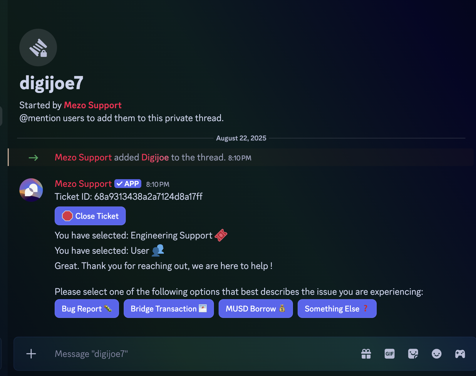 Section titled “Engineering Support (User Path)”For users seeking engineering support, let us know whether your issue is related to a bug you would like to report, an issue related to bridging funds into Mezo, an issue related to MUSD borrow, or something else.